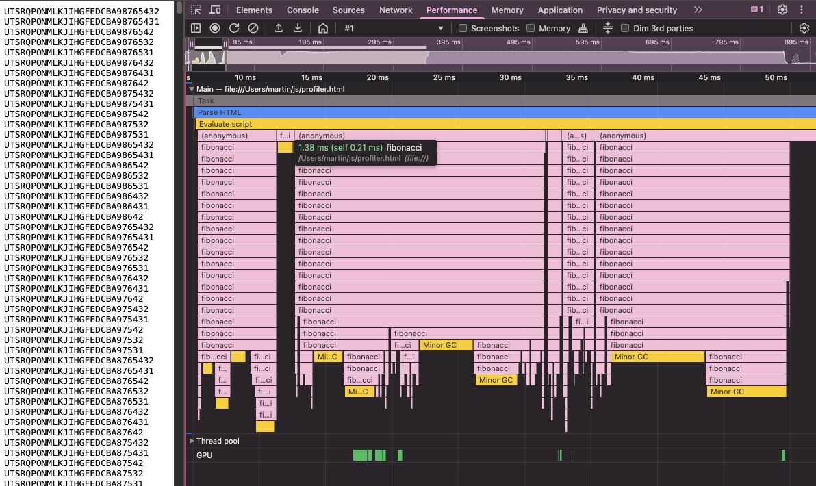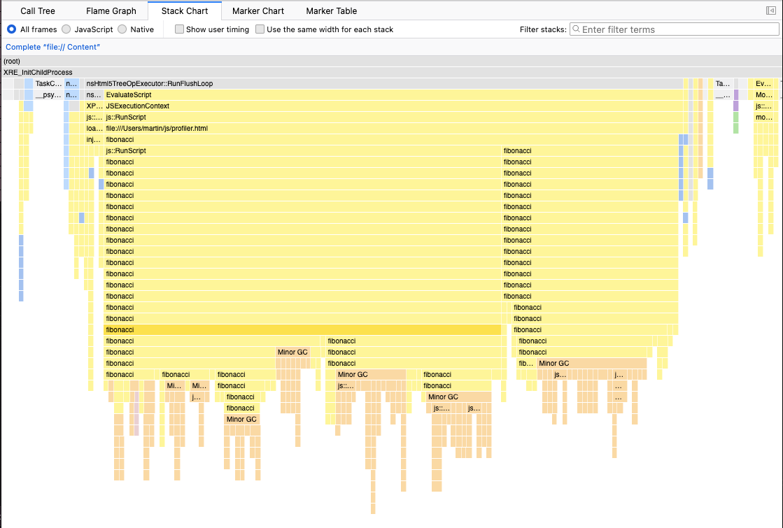 I picked fibonacci because we need to make the engine work a little bit for the bad samples to show up. On my laptop I need to go to something like fibonacci(30) for it to show nicely. Here’s what you should see if you reload that html file while recording a profile (zoomed at just the script execution range).