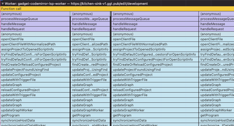 I have spent a fair bit of time in Chrome Dev Tools recently and learned the hard way that you need to be careful with interpreting the flame graph that you get when you record a Performance profile. To illustrate here’s a fragment of a flame graph captured from a worker running Typescript’s ProjectService used to typecheck source files.